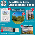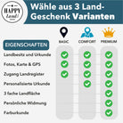 Differences between land gift variants: With the Comfort package, we print the name professionally on a black and white certificate. The Premium package also has a colored certificate, an optional personal dedication and a three times larger share of the property.