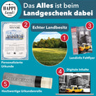 Differences between land gift variants: With the Comfort package, we print the name professionally on a black and white certificate. The Premium package also has a colored certificate, an optional personal dedication and a three times larger share of the property.