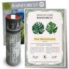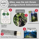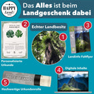 Differences between land gift variants: With the Comfort package, we print the name professionally on a black and white certificate. The Premium package also has a colored certificate, an optional personal dedication and a three times larger share of the property.