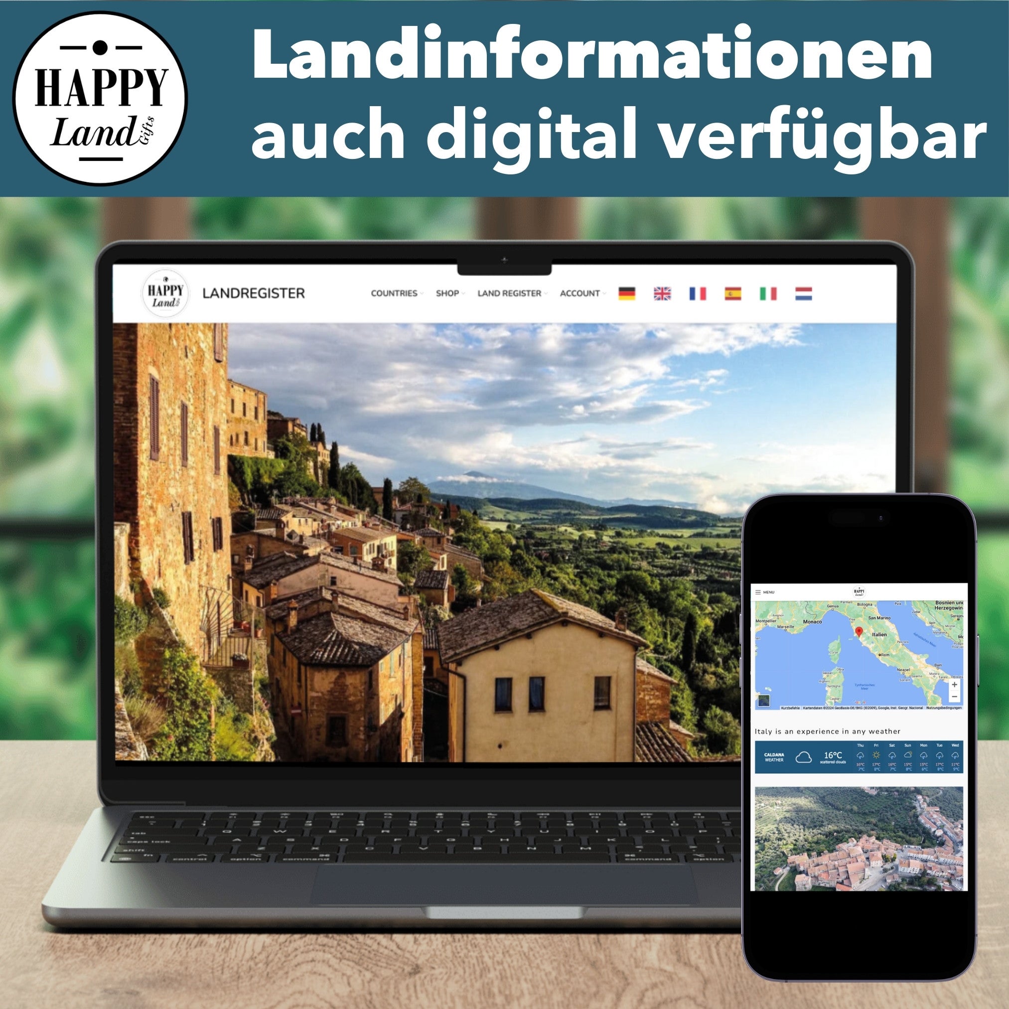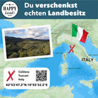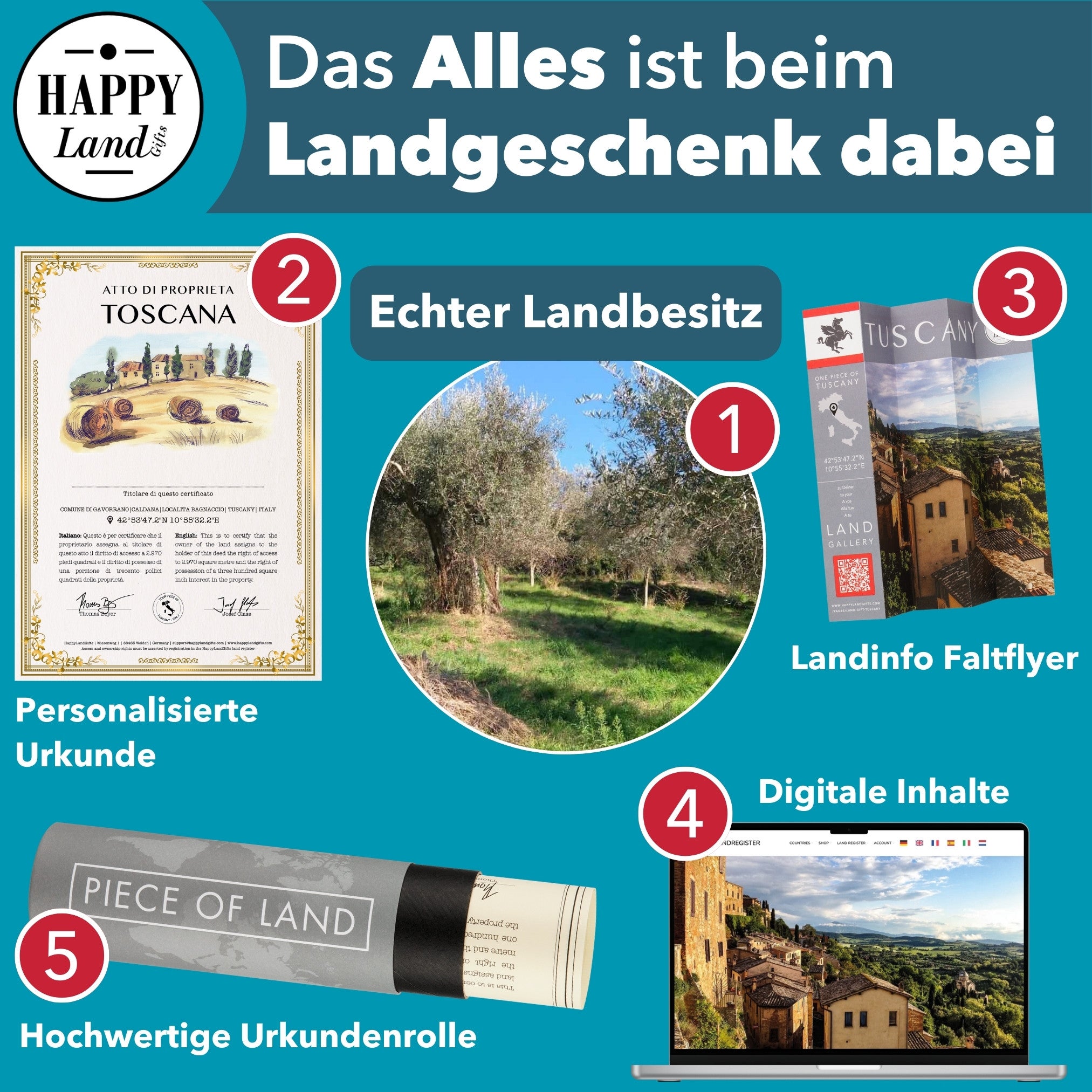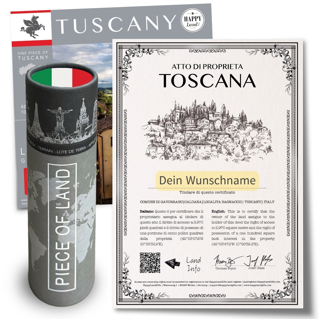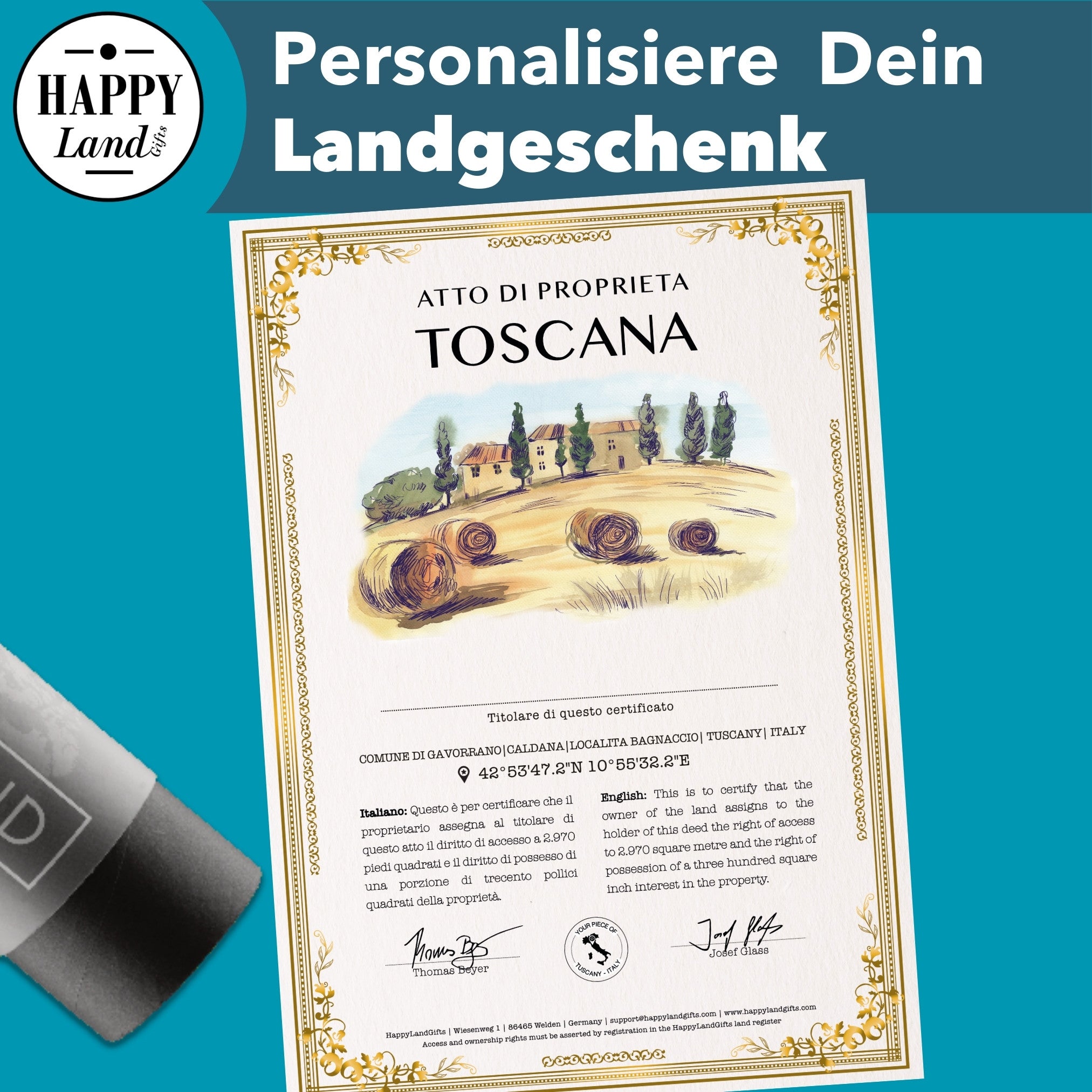 Besitzanspruch von 100 square inch (bei Premium 300 square inch) an dem ca. 2970 m² großen Grundstück in Caldana, mitten im Herzen der Toskana, umgeben von malerischen Landschaften und nicht weit von den berühmten Städten Rom und Florenz entfernt - inkl. vertraglich zugesichertes Betretungsrecht. Ideal als Geschenk für Weihnachten, Muttertag, Vatertag, Geburtstag, Hochzeiten, Valentinstag und Jubiläum.