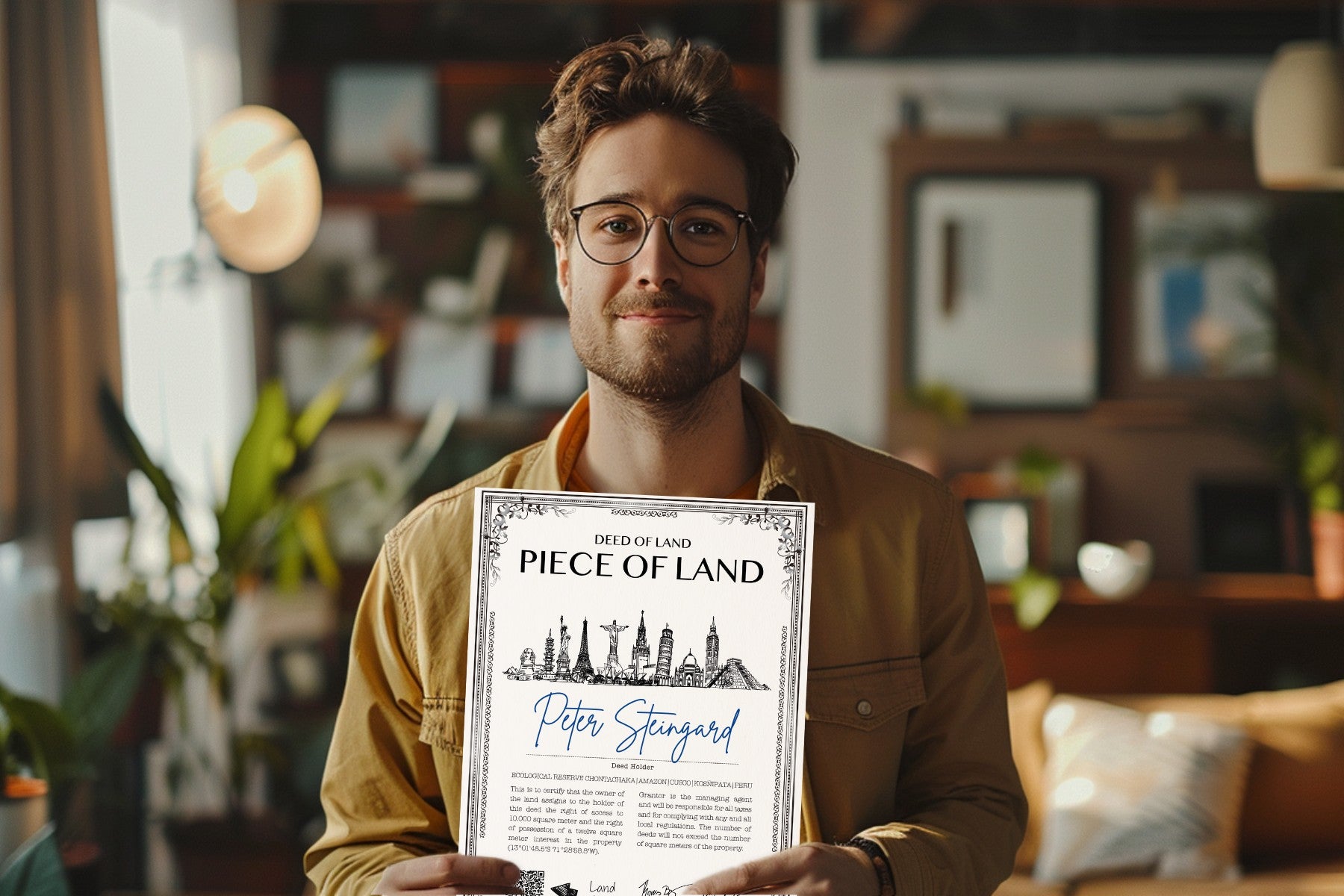 Unterschiede Landgeschenk Varianten: Beim Comfort-Paket drucken wir den Namen professionell auf eine SW Urkunde. Das Premium-Paket hat zusätzlich eine farbige Urkunde, optional eine persönliche Widmung und einen dreimal größeren Grundstücksanteil.